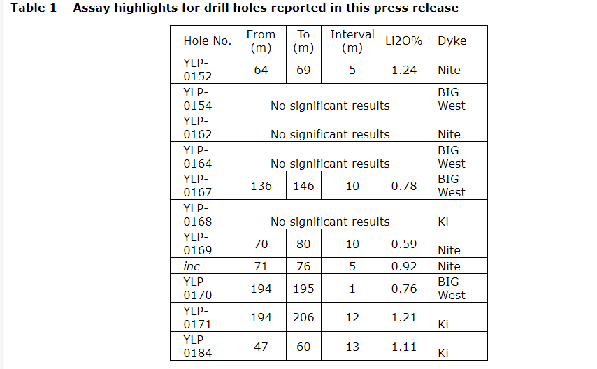 - YLP-0152: five m at 1.24 per cent Li2O (Nite).