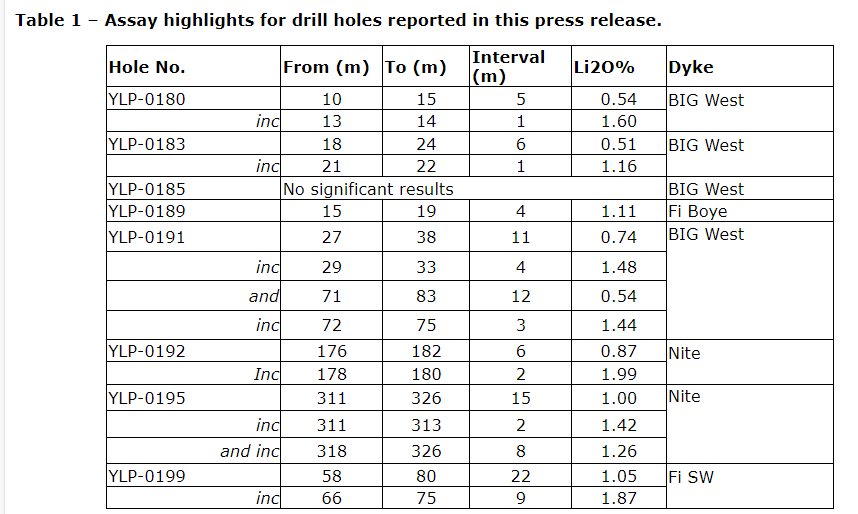 - YLP-0189: four m at 1.11 per cent Li2O (Fi Boye).
