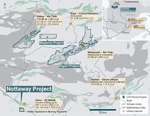 The Nottaway Project is located on the southern margin of the Frotet–Evans Greenstone Belt, where basalts of the Rabbit Formation are tightly bound by the Salamandre and Théodat tonalite–granodiorite intrusions that emplaced along the Nottaway Shear Zone during the Neoarchean orogeny. This places Nottaway within the same broader tectono-magmatic architecture responsible for the emplacement of the Moblan and Cisco lithium pegmatite systems to the north and East of the project, respectively (Figure 1).