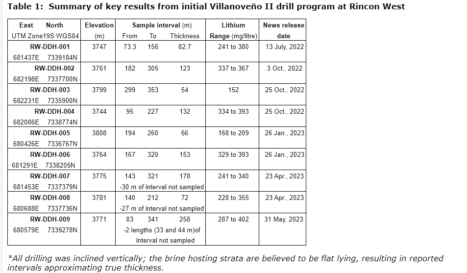 The 460.5-hectare Rinconcita II mining concession is contiguous to the company's Rincon West project, extending the project area eastward over the salt flat toward Rio Tinto's Rincon project. In July, 2023, the company completed 12 line km of controlled source audio-frequency magnetotelluric (CSAMT) geophysics surveys over the Rinconcita II property, demonstrating the presence of extremely conductive strata (low resistivity) at less than 100 metres below surface, consistent with formations saturated with lithium-bearing brines. With these results in hand, the company has engaged AGV Falcon Drilling SRL to drill test the property to confirm the presence of enriched brines at depth. With supervision from the company's geological team, the brines will be sampled for laboratory analysis, and the core samples extracted during diamond drilling will be tested to determine formation porosity and relative brine recovery. The company anticipates five diamond drill holes to be followed by one rotary drill well for pump testing during this campaign. The company completed the first hole of this campaign during September, 2023, and has now begun drilling the second exploration hole. The northern Paso de Sico concession block is currently undrilled and is undergoing permitting required for exploration geophysics and drilling.