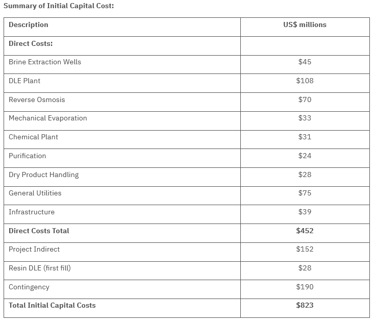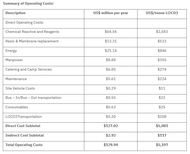 The cost estimates include the initial investment and sustaining capital for a lithium concentration plant with an annual capacity of 25,000 tonnes LCE.