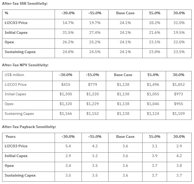 Sensitivity analysis that was conducted on the Arizaro project revealed that the project is most sensitive to changes in lithium carbonate price and, to a lesser extent, to initial capital costs, operating costs and sustaining capital requirements.