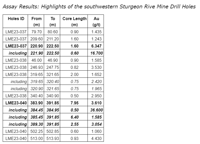 The results from the four aforementioned diamond drill holes, LME22-037 to LME22-040, include the intersection highlights as shown in the attached table.