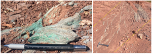 Newly discovered outcropping sediment-hosted copper mineralization at Mirador. Yellow dashed lines indicate minimum stratigraphic thickness of mineralization. Recent alluvial sediment obscures the geological boundary.