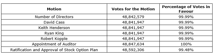 Votes representing 48,847,648 shares were cast, representing 68.34 per cent of the issued and outstanding shares at the record date. A summary of the meeting results is outlined in the attached table.