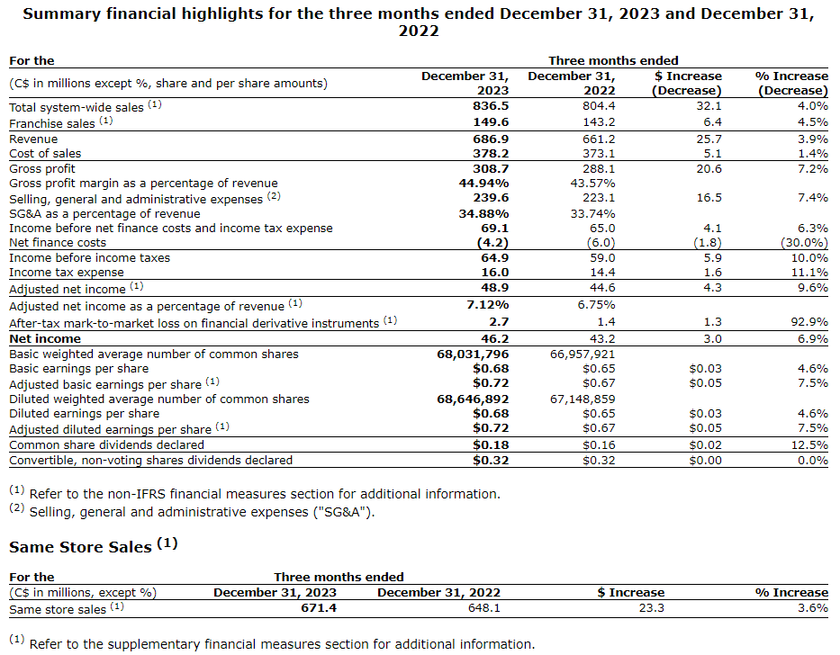 - Total system-wide sales for the fourth quarter 2023 were a record $836.5-million, an increase of 4 per cent.