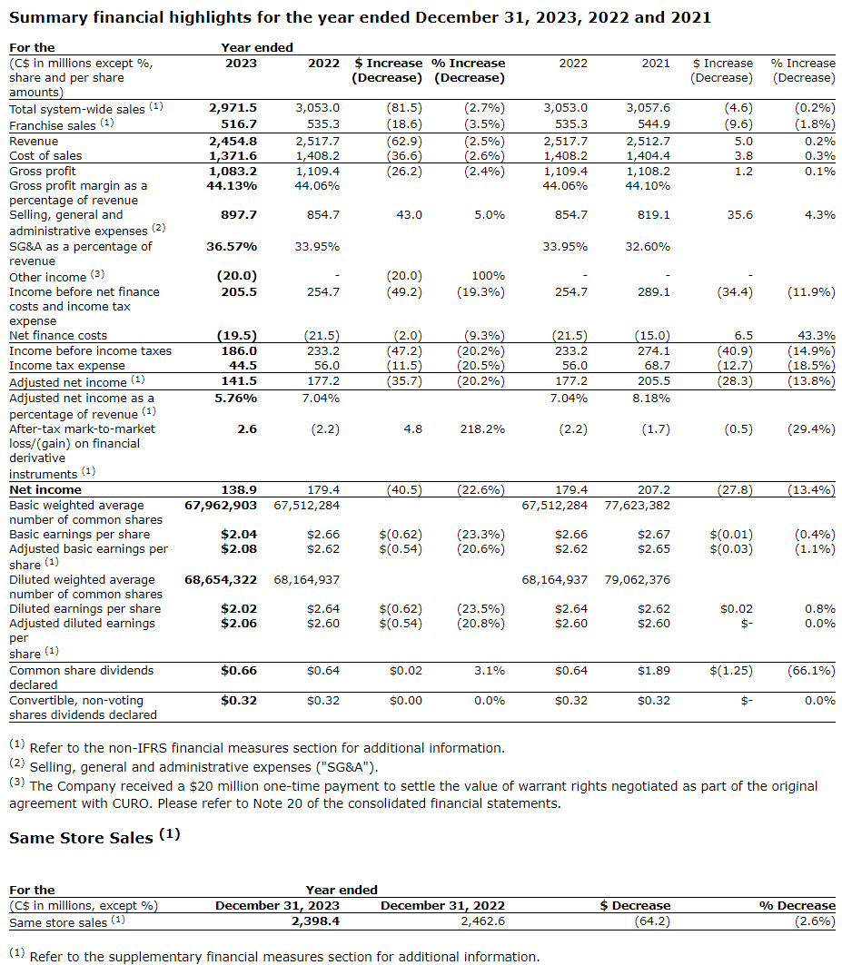 Same-store corporate sales decreased by 2.6 per cent, or $64.2-million, comparable with the year ended Dec. 31, 2022, driven by the factors discussed in the revenue section above.