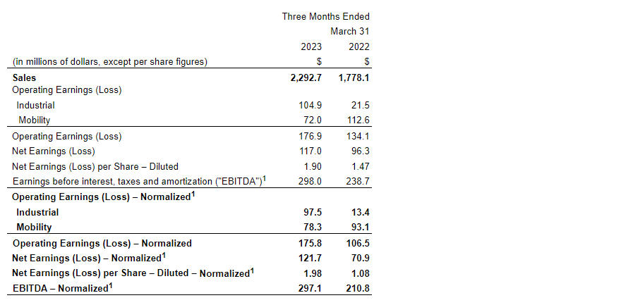 Sales for the mobility segment increased by $297.8-million, or 21.1 per cent in, Q1 2023 compared with Q1 2022. The sales in Q1 2023 were impacted by: