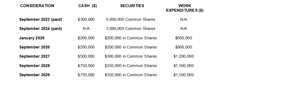 The number of common shares represented by the $200,000, $200,000, $300,000, $350,000 and $350,000 in common shares to be issued in January, 2026, September, 2026, September, 2027, September, 2028, and September, 2029, respectively, will have a deemed price per share equal to the 20-day VWAP (volume-weighted average price) of the issuer's shares on the exchange on the applicable anniversary date of the agreement, subject to a minimum price of five cents per share.