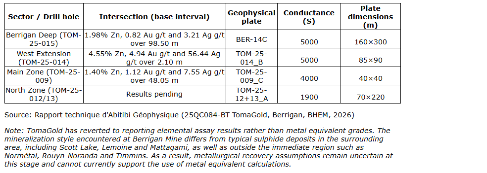 David Grondin, president and chief executive officer of TomaGold, stated: "The geophysics confirm what our drill cores indicated: Berrigan mine sits on a large-scale mineralized system. The BER-14C plate, in particular, extends the mineralization signature of holes TOM-25-014 and TOM-25-015 with a vector pointing to an even more conductive zone to the northeast."