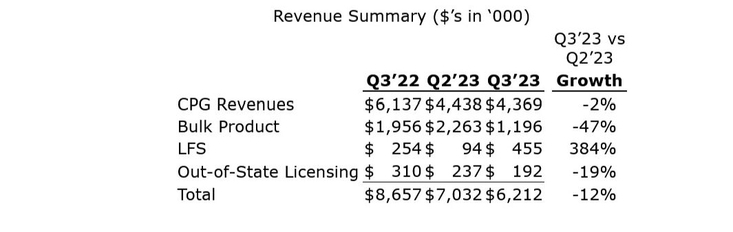 In Q3 2023 the Company generated revenue of $0.5 million associated with Lowell Farm Services compared to $0.1 million in Q2 2023. LFS revenue includes sales of third party bulk flower.
