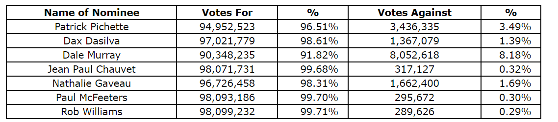 Shareholders of the company voted in favour of all items of business put forth at the meeting by the company. The voting results for each item of business at the meeting are presented herein.