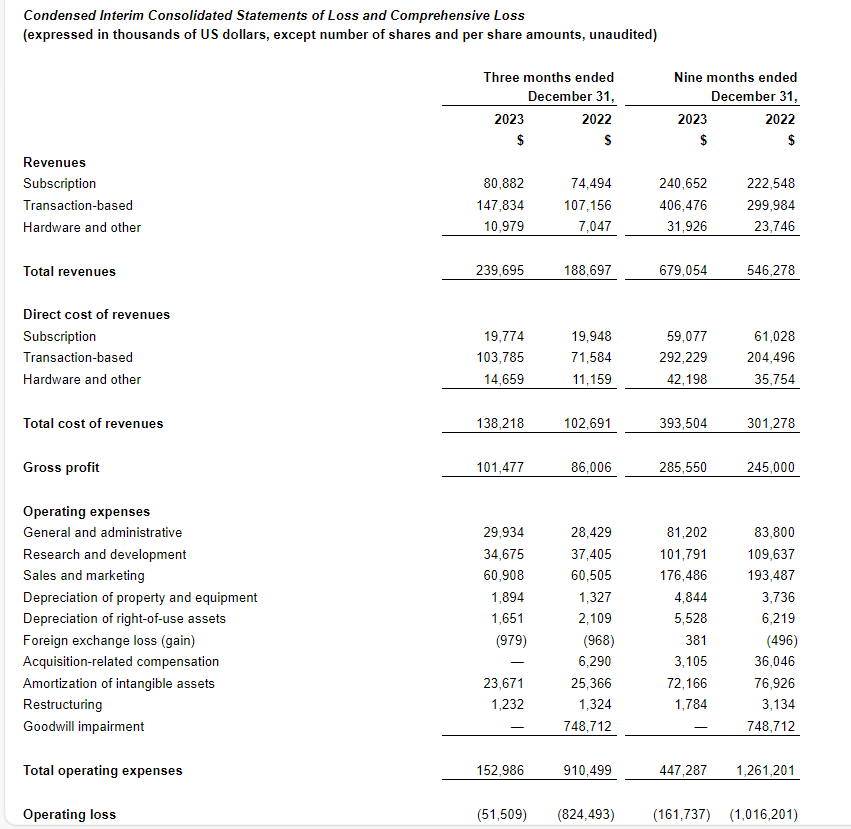 Lightspeed Commerce Inc. has released financial results for the three and nine months ended Dec. 31, 2023. Amounts are expressed in U.S. dollars and in accordance with IFRS (international financial reporting standards).