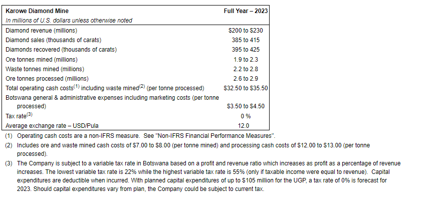 This section of the press release provides management's production and cost estimates for 2023. These are forward-looking statements and subject to the cautionary note regarding the risks associated with forward-looking statements. Diamond revenue guidance does not include revenue related to the sale of exceptional stones (an individual rough diamond which sells for more than $10-million), or the Sethunya.