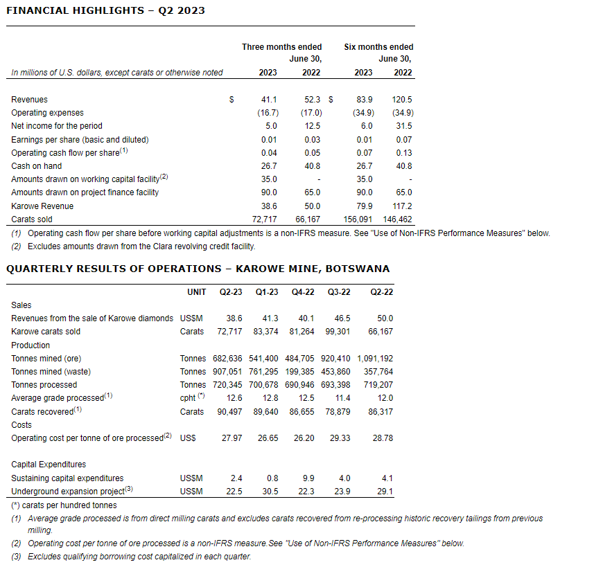 Revenues of $41.1-million (Q2 2022: $52.3-million) reflected a continuation of weaker diamond prices and a planned change in product mix beginning in early 2023. During Q2 2023, 12 per cent of the carats processed were recovered from the Centre Lobe and 88 per cent were recovered from South Lobe material (Q2 2022: 100 per cent South Lobe ore). Most of the carats recovered in the second quarter will be sold in the third quarter of 2023;