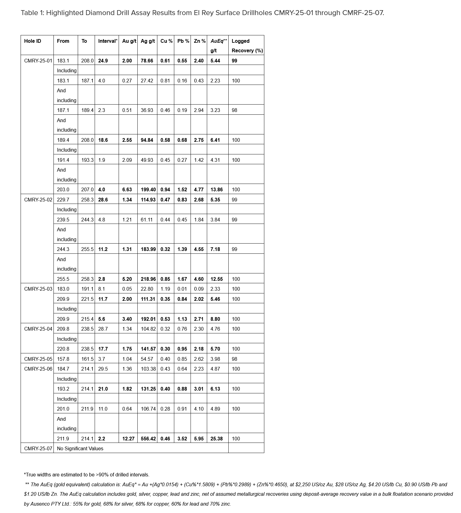• 28.6 metres of 5.35 grams per tonne gold equivalent, including 2.8 m of 12.55 g/t AuEq (CMRY-25-02);
