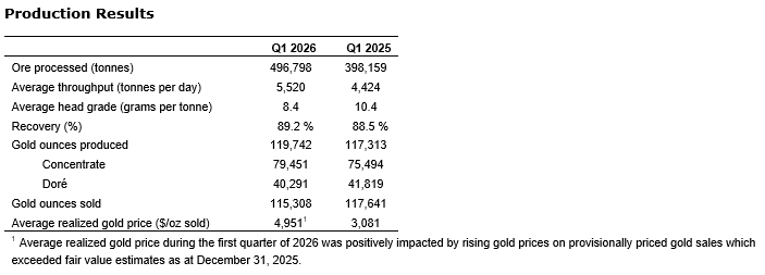 In the first quarter of 2026, the mill processed 496,798 tonnes of ore resulting in an average throughput rate of 5,520 tonnes per day at an average grade of 8.4 grams per tonne with recoveries of 89.2 per cent.