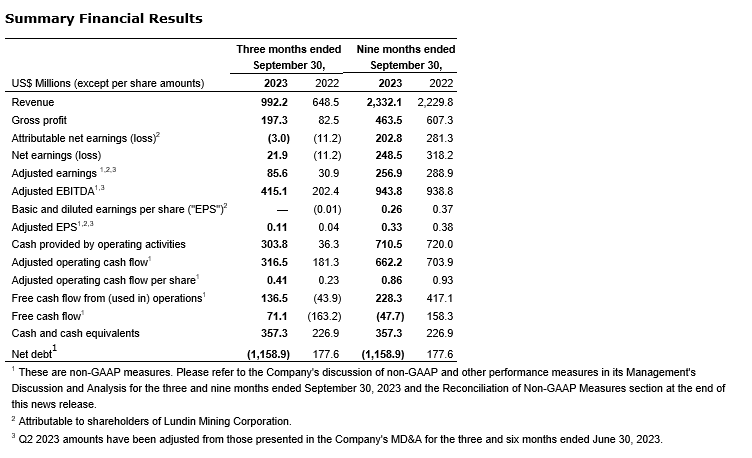 LUNDIN MINING THIRD QUARTER 2023 RESULTS