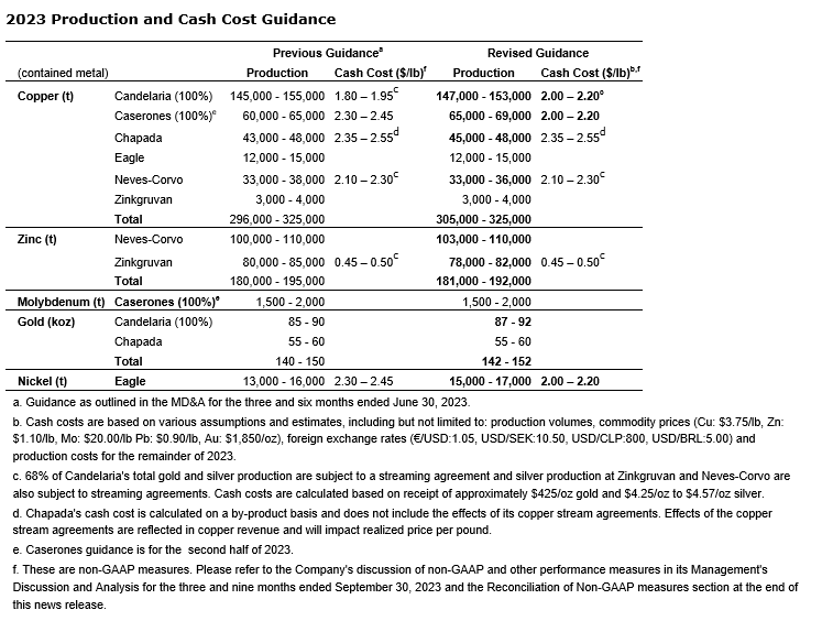 Production and cash cost guidance for 2023 is updated from that disclosed in the company's management's discussion and analysis for the three and six months ended June 30, 2023.