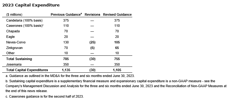 As a result of rephasing several projects at Neves-Corvo and Zinkgruvan, capital expenditure guidance is lower by an additional $30-million for 2023. As disclosed in the company's management's discussion and analysis for the three and six months ended June 30, 2023, capital spend guidance at Josemaria was previously lowered to $350-million for 2023 due to foreign exchange, a delay in planned equipment deliveries and reduced activities.