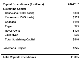 - Capital expenditures are forecast to total $1,065-million on a 100-per-cent basis, including expansionary capital expenditures (12), on the Josemaria project. The majority of sustaining capital expenditures is for open-pit waste stripping, underground mine development, tailings storage facility and water management works.