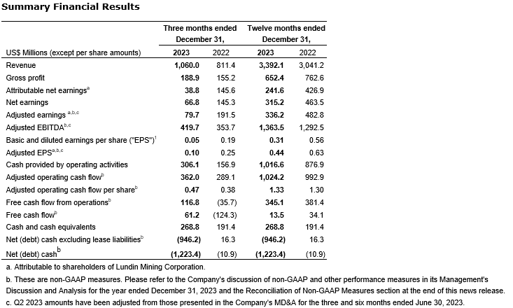 LUNDIN MINING FOURTH QUARTER AND FULL YEAR 2023 RESULTS