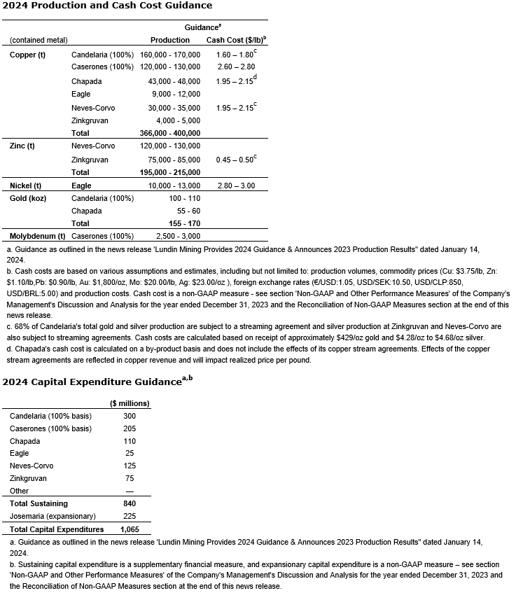 Production, cash cost, capital expenditure and exploration investment guidance for 2024 remains unchanged from the most recently reported guidance as outlined in the news release "Lundin Mining Provides 2024 Guidance & Announces 2023 Production Results" dated Jan. 15, 2024.