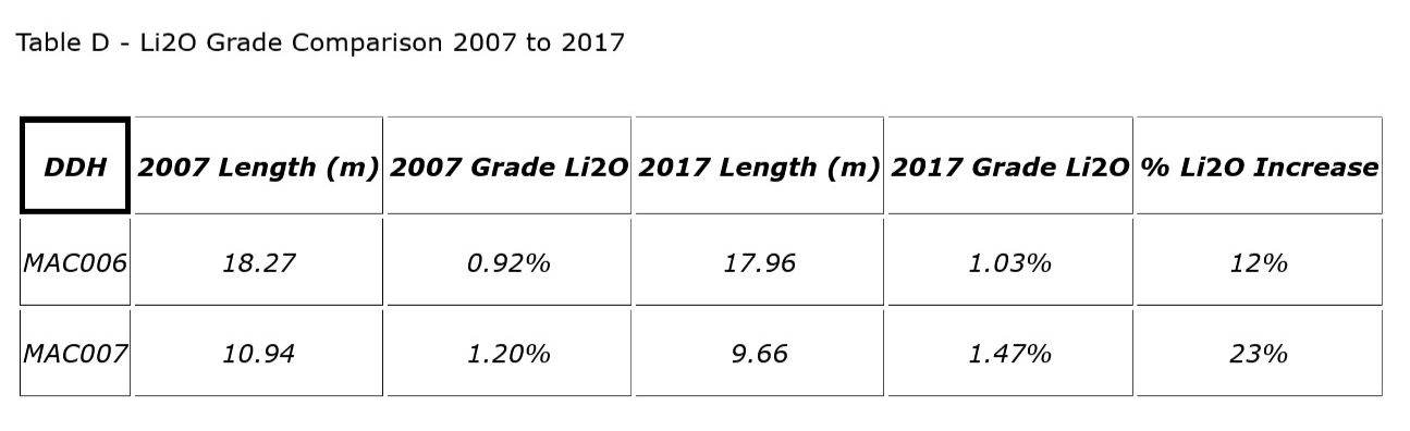 In 2017 the Company resampled the 2007 drill core as the previous property owner's focus was on tantalum and tin and many of the 2007 samples exceeded the upper detection limit for lithium (1%) and were not further analyzed. The resampling highlights can be found in Table D.
