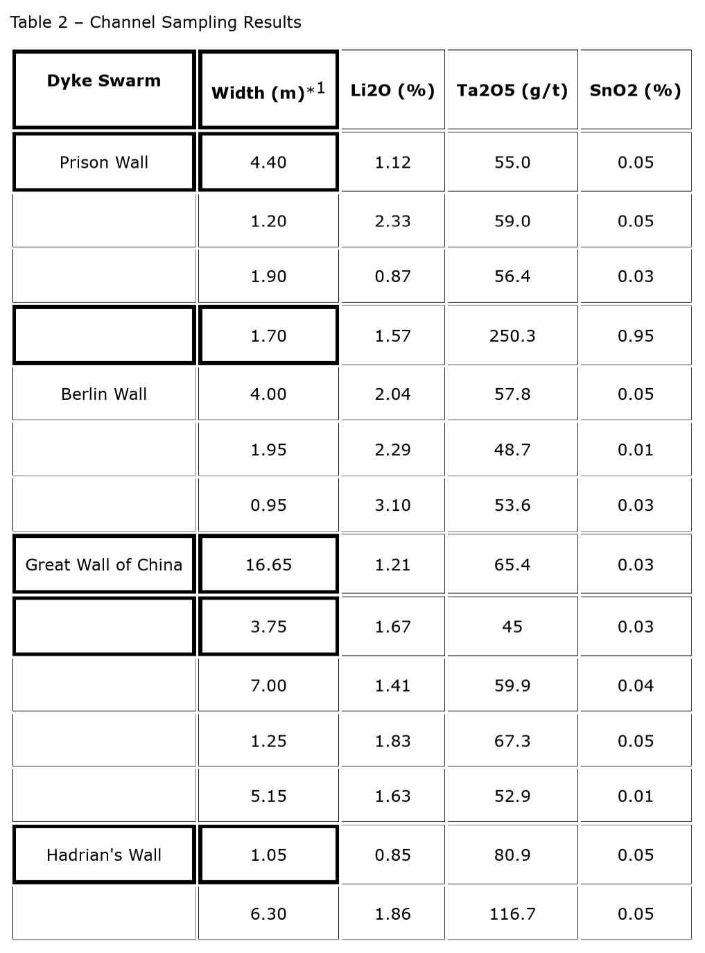 A channel sampling program was conducted on the Project in 2016 confirming the grade and tenor of the lithium occurrences at surface (Table 2).