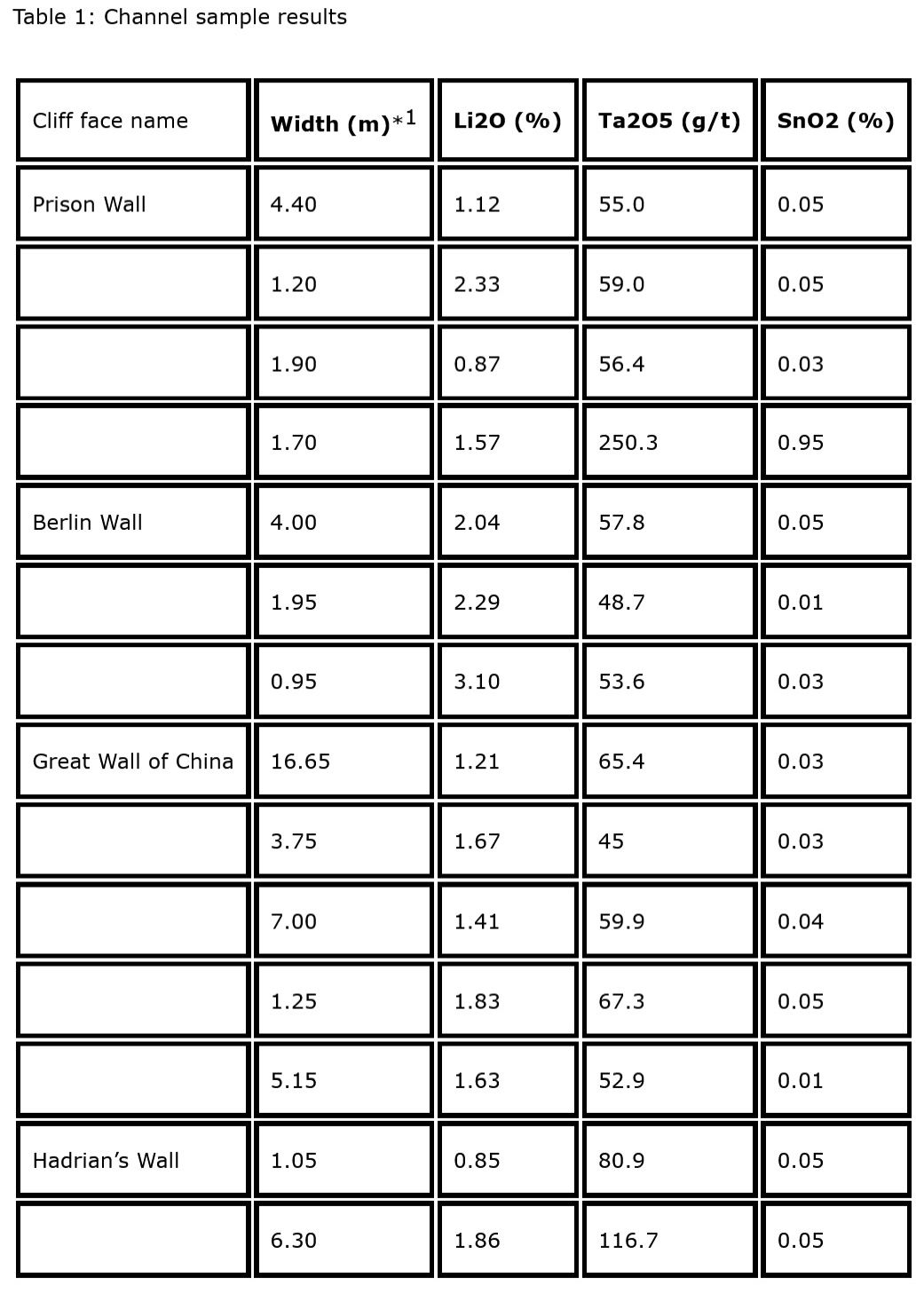 In the past field crews sampled the exposed pegmatite outcrop in the faces of the cliffs that define the cirques, the cliff faces were given colloquial names after famous "walls." Table 1 lists the channel samples from the various cliff faces sampled. The small dykes sampled in Table 1 would not be able to be resolved in the magnetic data due to the small width, only the larger dykes and the combined swarms will show. Refer to Figure 2 for locations. The dyke swarm seems to continue in the magnetic data to the south past Cirque 6 in an unexplored part of the property. Figure 2 also illustrates an 80 m to 100m wide magnetic signature that traverses the entire data set for several kilometers. This anomaly has been named Alpha Prime. Several scout drill holes are planned to test these, this summer.