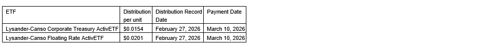 Lysander Funds Ltd. has declared February, 2026, cash distributions for each of Lysander-Canso Corporate Treasury ActivETF and Lysander-Canso Floating Rate ActivETF. Unitholders of record of each ETF (exchange-traded fund) at the close of business on the distribution record date will receive a cash distribution based on the number of units held in the amount indicated in the attached table, payable on or before the payment date.