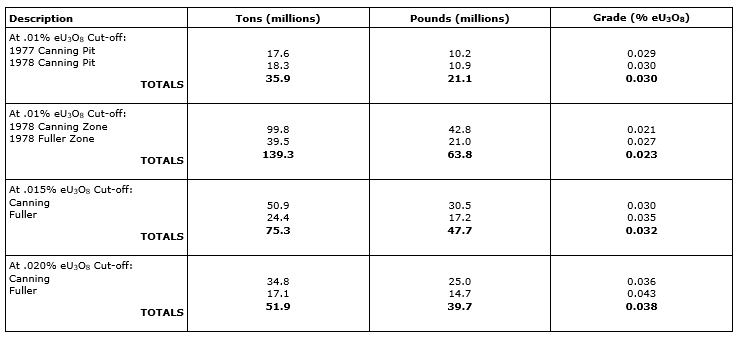 Deposit Grade (% eU3O8) Cut-off (% eU3O8) Pounds (Mlb) Source