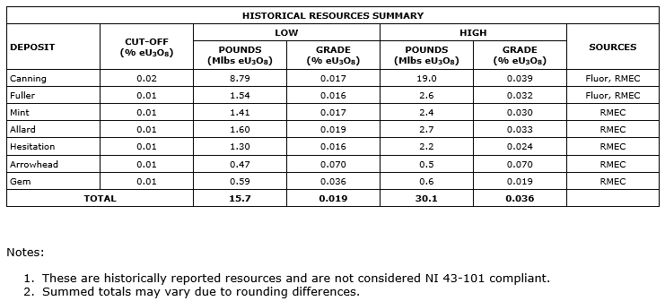 Based on the information discussed herein, an attached table summarizes the range of potential uranium resources as reviewed and reported by Mr. Liller (1991) and Mr. Zabev (Howe, 1997).