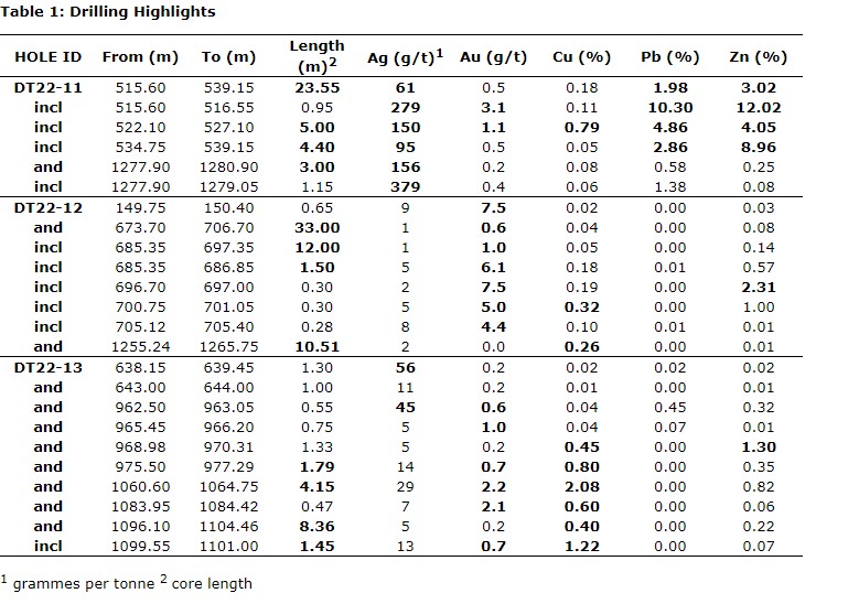 - DT22-12 -- 33 m gold zone: Hole 12 was drilled 800 m to the north of Carissa and under a similar topographic depression. It cut 33 m of weak manto alteration averaging 0.6 g/t gold that encompasses at least four narrow high-grade gold-bearing structures, the best of which ran 6.1 g/t gold over 1.5 m (see attached table). The overall zone appears to line up with a similar zone intercepted about 175 m to the southeast in DT20-01. It also cut 10.5 m of