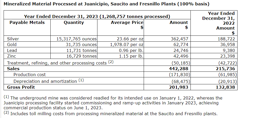 Juanicipio generated strong operating cash flow of $84,038 and free cash flow of $61,993 in the fourth quarter. Operating cash flow and free cash flow for 2023 totalled $145,064 and $60,814, respectively.