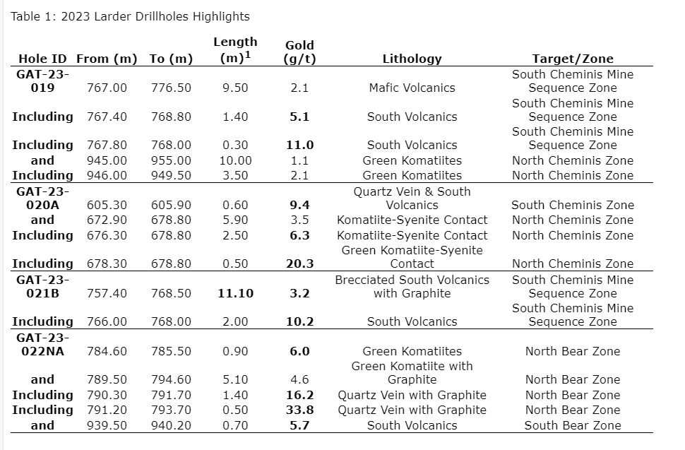 Cheminis success: The magnetotellurics survey carried out in the summer of 2023 enabled modelling of the south volcanic gold zone at Cheminis and is proving to be applicable elsewhere across the property. Drilling in three successive Cheminis drill holes (GAT-23-019, 020A and 021B) intersected grades of 1.1 to 20.3 g/t gold over core lengths of 0.6 to 11.1 metres demonstrating continuity. This also extended the gold-hosting mine sequence down to 700 metres below surface, more than 370 metres below the deepest workings in this portion of the Cadillac-Larder break. Incorporating these results into the model should enhance predictability in follow-up drilling;