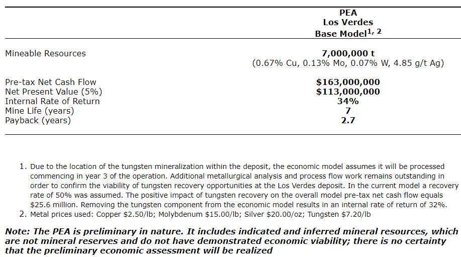 The Los Verdes deposit PEA is based on a resource estimate completed by Golder Associates which contains a total resource (measured plus indicated) of 7.7 Mt -- 0.64 per cent copper, 0.12 per cent molybdenum, 0.07 per cent tungsten (W) and 4.75 g/t silver (Ag) (see Los Verdes resource estimate section for details). The study envisions the construction of a new mine and processing facility with an average annual production rate of approximately one Mt over a seven-year mine life. Highlights from the study are as shown in the associated table.