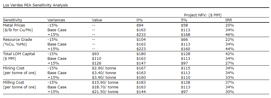 The results of a sensitivity analysis performed on the Lose Verdes deposit PEA base case economic model are shown in the table entitled "Los Verdes PEA sensitivity analysis." The sensitivity modelling demonstrates that the project economics are most impacted by variations in metal prices and mined grades, and least impacted by capital requirements and operating costs.
