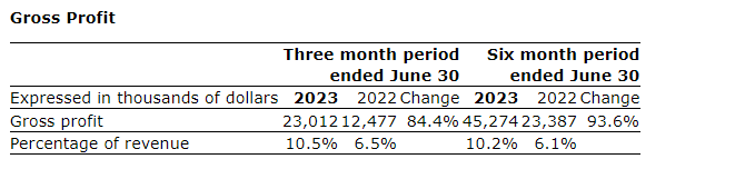 Gross profit of $23.0-million for the second quarter of 2023 was $10.5-million higher than the $12.5-million gross profit for the second quarter of 2022, and gross profit as a percentage of revenues of 10.5 per cent for the second quarter of 2023 increased from 6.5 per cent recorded in the same period in 2022. The gross profit in the current quarter increased from the same quarter in the prior year as a result of volume and price increases on certain programs and favourable product mix, offset in part by supply chain disruptions and price increases of purchased materials and supplies.
