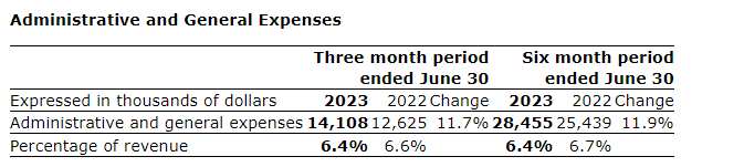 Administrative and general expenses as a percentage of revenues was 6.4 per cent for the second quarter of 2023, lower than the same period of 2022 percentage of revenues of 6.6 per cent. Administrative and general expenses increased $1.5-million or 11.7 per cent to $14.1-million in the second quarter of 2023 compared with $12.6-million in the second quarter of 2022 mainly due to higher salary and benefit costs, and short-term compensation accruals.