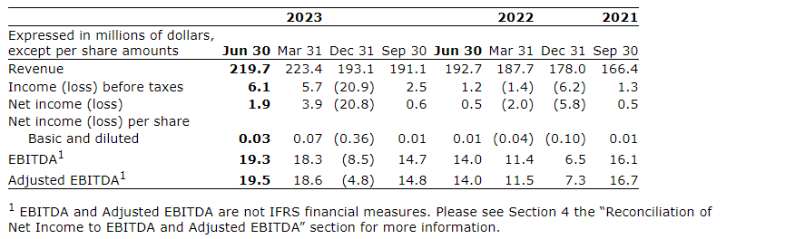 The corporation reported revenue in the second quarter of 2023 of $219.7-million, a $27.0-million increase from second quarter of 2022 revenue of $192.7-million. Gross profit and net income for the second quarter of 2023 were $23.0-million and $2.0-million, respectively, in comparison with gross profit of $12.5-million and net income of $500,000 for the second quarter of 2022.