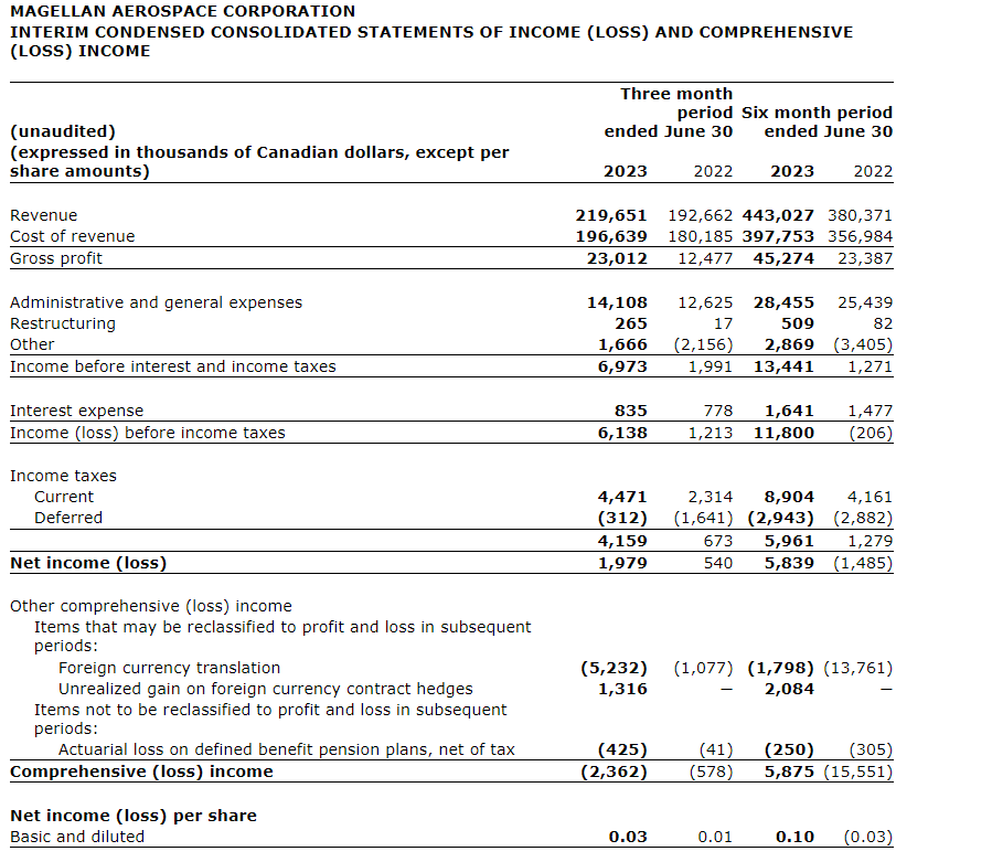 Magellan Aerospace Corp. has released its financial results for the second quarter of 2023. All amounts are expressed in Canadian dollars unless otherwise indicated. The results are summarized as shown in the attached table.