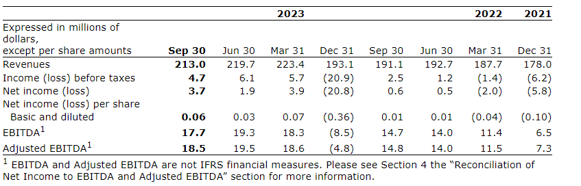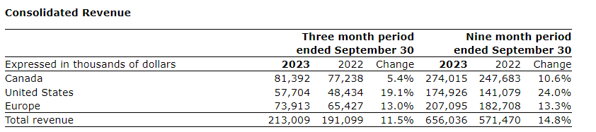 Revenue for the third quarter of 2023 of $213.0-million was higher than that in the third quarter of 2022. The average quarterly exchange rate of the United States dollar relative to the Canadian dollar in the third quarter of 2023 was 1.3412 versus 1.3061 in the same period of 2022. The average quarterly exchange rate of the British pound relative to the Canadian dollar increased from 1.5350 in the third quarter of 2022 to 1.6974 during the current quarter. The average quarterly exchange rate of the British pound relative to the United States dollar increased from 1.1753 in the third quarter of 2022 to 1.2658 in the current quarter. Had the foreign exchange rates remained at levels experienced in the third quarter of 2022, reported revenues in the third quarter of 2023 would have been lower by $3.0-million.