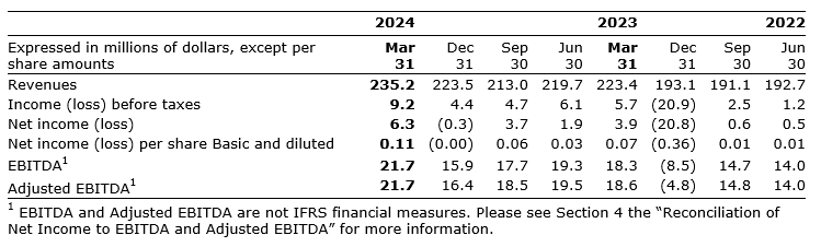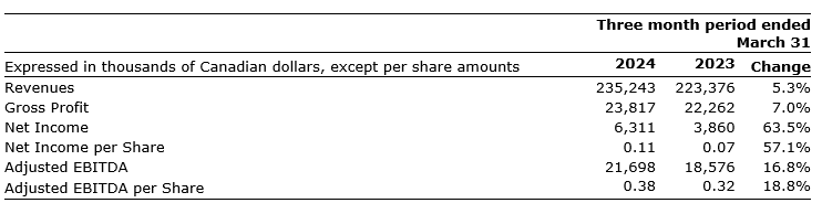 The corporation reported revenue in the first quarter of 2024 of $235.2-million, an $11.8-million or 5.3-per-cent increase from the first quarter of 2023 revenue of $223.4-million. Gross profit and net income for the first quarter of 2024 were $23.8-million and $6.3-million, respectively, in comparison with gross profit of $22.3-million and net income of $3.9-million for the first quarter of 2023.