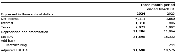 Adjusted EBITDA in the first quarter of 2024 increased $3.1-million or 16.8 per cent to $21.7-million in comparison with $18.6-million in the same quarter of 2023, mainly as a result of higher net income driven largely by volume increases, contract rehabilitations and favourable product mix, higher interest and taxes, and lower depreciation and amortization expenses.