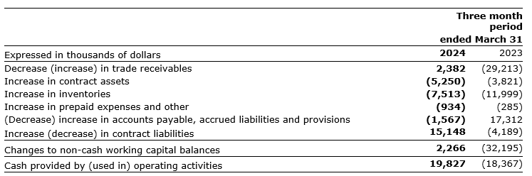 For the three months ended March 31, 2024, operating activities provided $19.8-million of cash, compared with $18.4-million used in the first quarter of 2023. Changes in non-cash working capital items provided cash of $2.3-million, $34.4-million higher when compared with the usage of $32.2-million in the prior year. This increase is largely attributable to decreases in accounts receivables from timing of customer payments, increases in contract liabilities due to timing of customer deposits offset in part by increases in contract assets and inventories, and decreases in accounts payable, accrued liabilities and provisions, primarily driven by timing of material purchases and supplier payments.
