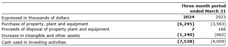 Investing activities used $7.5-million of cash for the first quarter of 2024, compared with $4.1-million of cash used in the same quarter of the prior year, an increase of $3.4-million in investing activities due to higher spending on intangible and other assets, and higher levels of investment in property, plant and equipment.