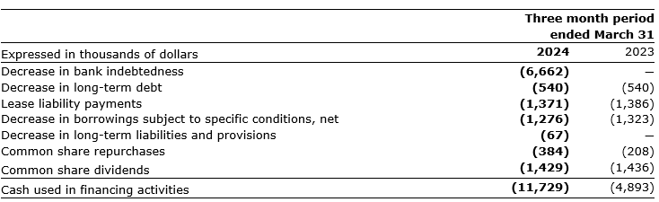 Financing activities used $11.7-million of cash in the first quarter of 2024 compared with $4.9-million of cash used in the same quarter of the prior year. In the current quarter, cash usage was mainly for the repayment of bank indebtedness, the payment of common share dividends, lease liability payments and decreases in borrowings subject to specific conditions.