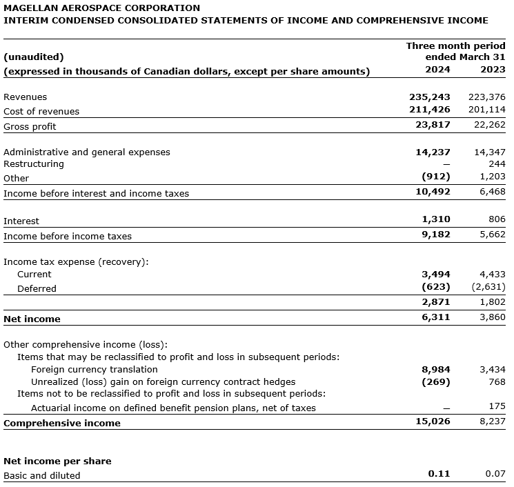 Magellan Aerospace Corp. has released its financial results for the first quarter of 2024. All amounts are expressed in Canadian dollars unless otherwise indicated. The results are summarized in an attached table.