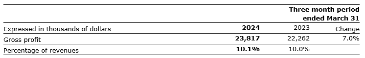 Gross profit of $23.8-million for the first quarter of 2024 was $1.5-million higher than the $22.3-million gross profit for the first quarter of 2023 and gross profit as a percentage of revenues of 10.1 per cent for the first quarter of 2024 increased from the 10.0 per cent recorded in the same period in 2023. The gross profit in the current quarter increased from the same quarter in the prior year as a result of volume increases and contract rehabilitations on certain programs in addition to favourable product mix, offset in part by supply chain disruptions and material cost increases.